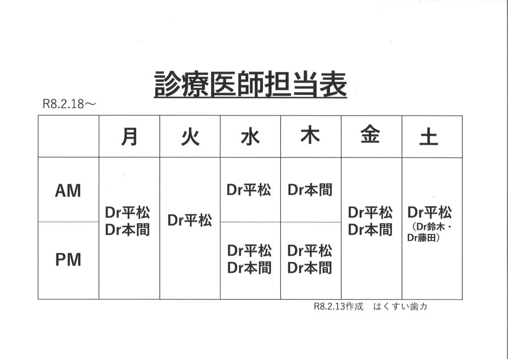 2026/02/13 お知らせ 診療医師担当の変更 最近は、なかなかお天気に恵まれませんね😢 足元が悪い中ご来院いただきましてありがとうございます。 2月18日より、診療医師の担当曜日が変更になりますのでこちらの表をご参考にしていただければと思います。 まだまだ気温も低いので体調にもお気をつけてくださいね☺ 前の記事へ 一覧へ戻る